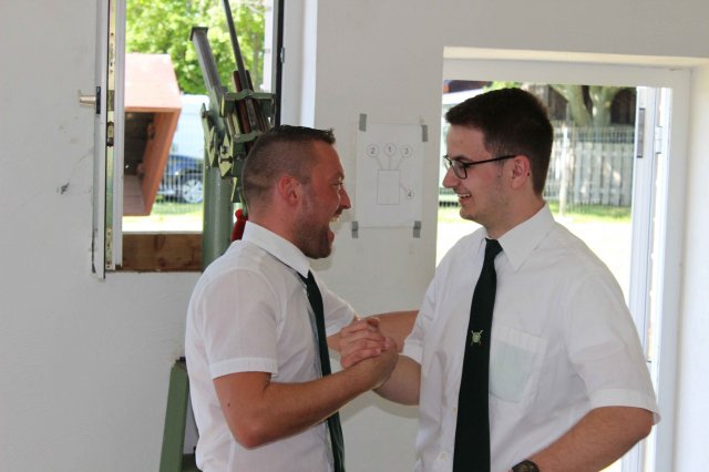 Die Kommandanten Hans Wollersheim und Hans-Josef Schröder reihen die Majestäten und Ehrengäste wieder in den Festzug ein