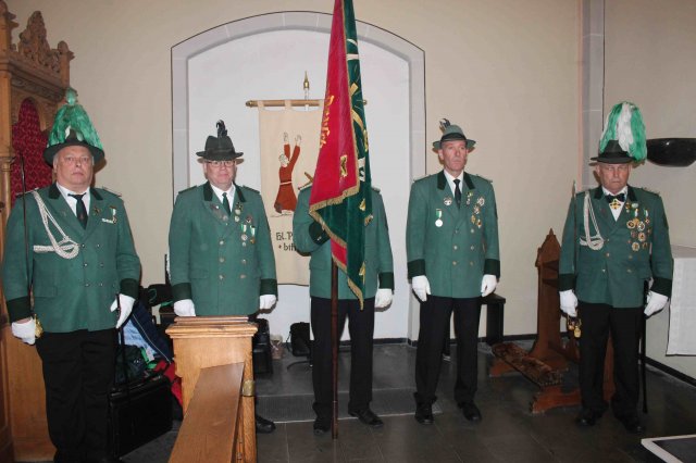 Fahnenabordnung während der Heiligen Messe am SamstagVon links nach rechts:Kommandant Hans WollersheimAdjutant Ralf SchwierFahnenträger Arnd WirtzAdjutant Bert ElsigKommandant Herbert Wollersheim