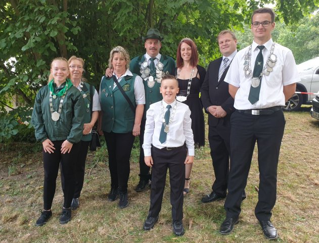 Die neuen Majestäten 2019/2020Von links nach rechtsSchülerprinzessin Lea LangenDahinter Kaiserin Brigitte LangenSchützenkönig Sascha Tenten mit Partnerin Petra SpürkelBürgerkönigin Claudia Reinig mit Ehemann MatthiasJungschützenkönig Moritz JansenVorne Bambiniprinz Rafael Hoffmann