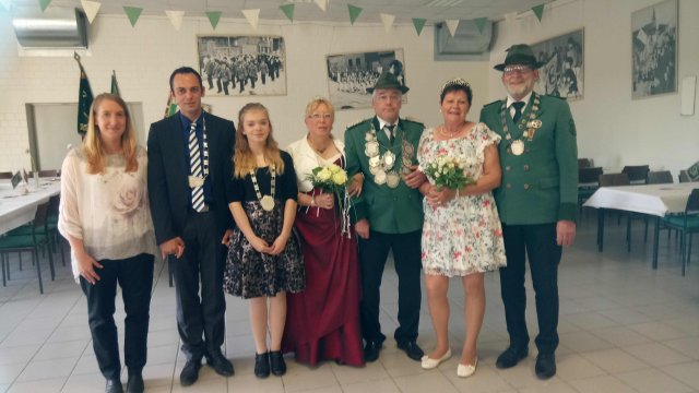 Die neuen Majestäten 2017/2018 (von links nach rechts):Bürgerkönig Stefan Knop mit Ehefrau JennySchülerprinzessin Lea LangenSchützenkönig Arnd Wirtz mit Begleitung Brigitte LangenKaiser Rainer Neumann mit Ehefrau Bärbel