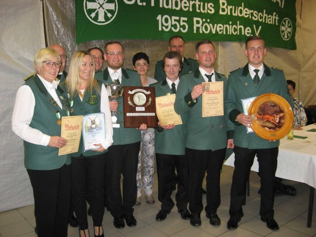 Sieger und Ausgezeichnete beim HubertusessenVorne (von links nach rechts)Petra Katemann (40 Jahre Mitgliedschaft)Jessica SaurAndreas Hofmeister (Vereinsmeister)Jörg Schwier (40 Jahre Mitgliedschaft)Florian Hofmeister (25 Jahre Mitgliedschaft)Bastian Hofmeister (Ehrenscheibe)Hinten (von links nach rechts)Präsident Karl HofmeisterNorbert Hütten (25 Jahre Mitgliedschaft)Berta Klein (25 Jahre Mitgliedschaft)Bernd Saur
